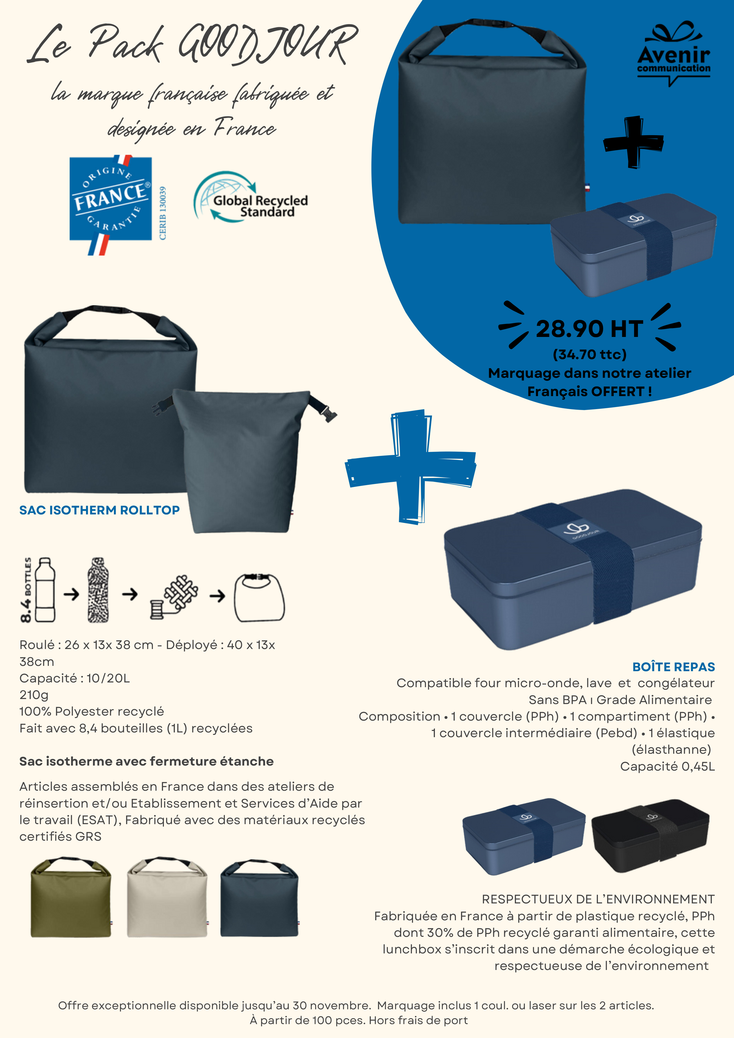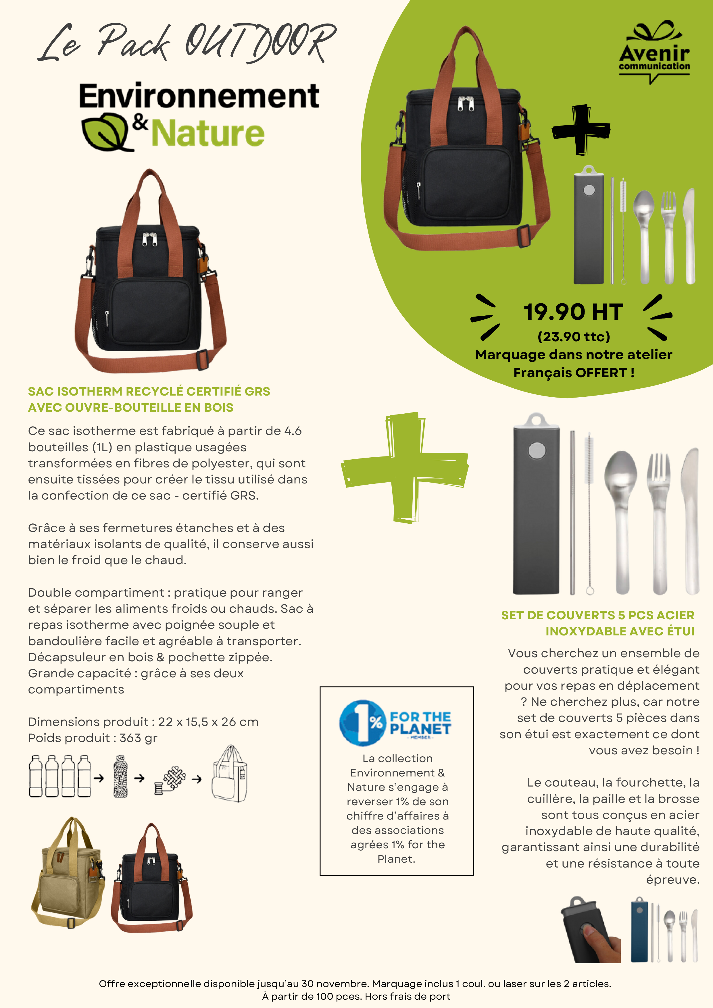 Pour cette fin d’année, Avenir Communication vous dévoile ses packs exclusifs alliant engagement, innovation et praticité. Que vous cherchiez un cadeau corporate ou un objet publicitaire, nos sélections Made in France, Outdoor et High-Tech répondront à tous vos besoins !